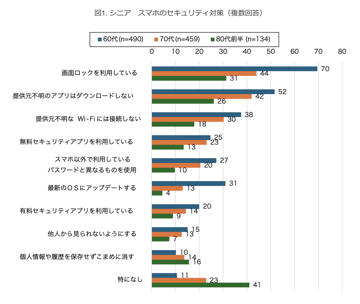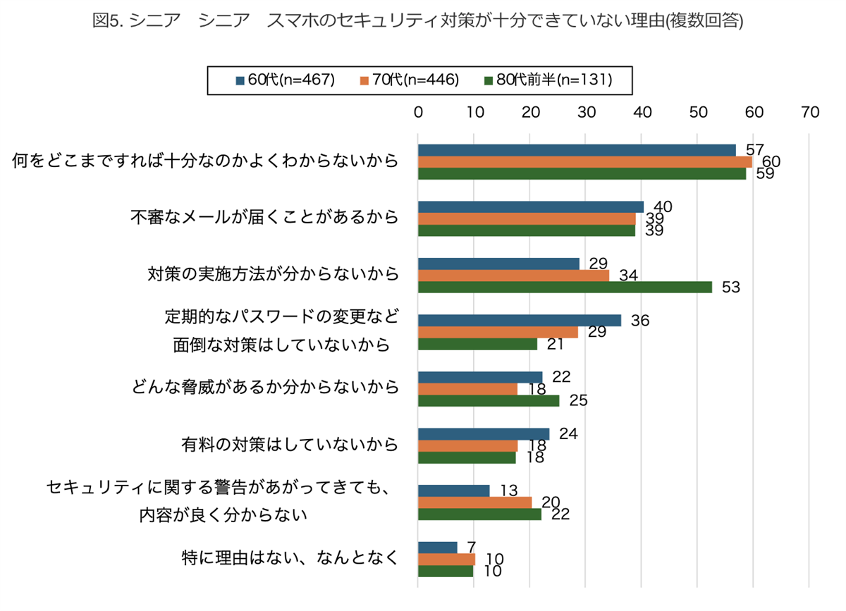 そのほか、「提供元不明のアプリはダウンロードしない」「提供元不明なWi-Fiには接続しない」なども、60代が最も実行している。一方、80代前半の4割は、なんの対策もしていない。