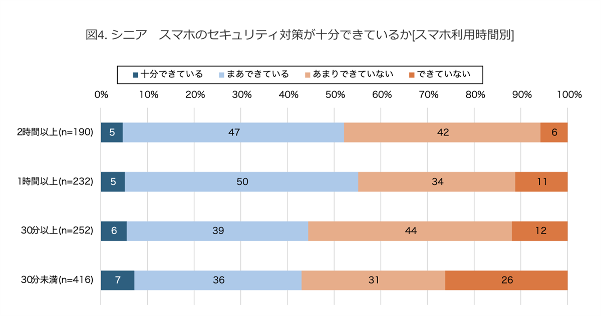 スマホの利用時間別にセキュリティ対策が十分かあわせて見たところ、「できている」と回答した割合に大きな差異は見られなかった。一方で、「できていない」割合はスマホ利用時間が短いと多い結果となった。セキュリティに対する不安が、スマホの利用の妨げになっている可能性があるというわけだ。