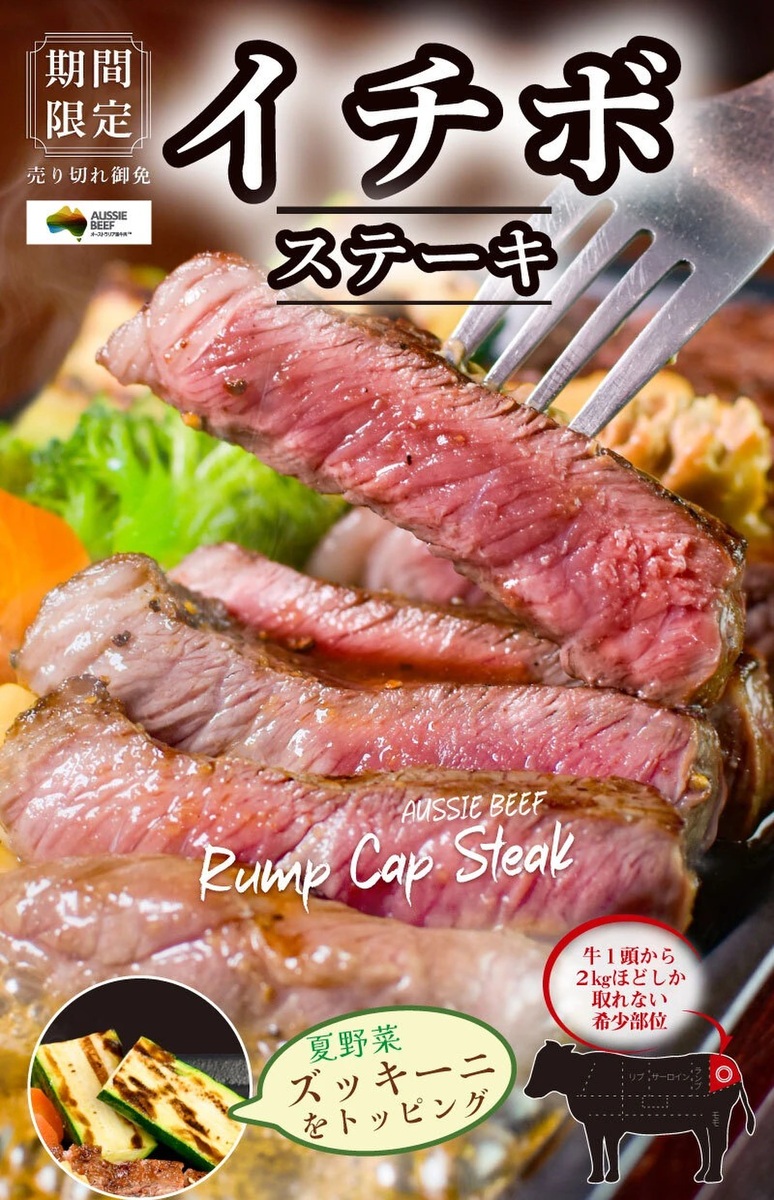 ステーキ専門店「いきなり!ステーキ」は、オーストラリア産「イチボステーキ」を7月25日~9月16日の期間限定で販売中です。末広町店を除く全店で展開。