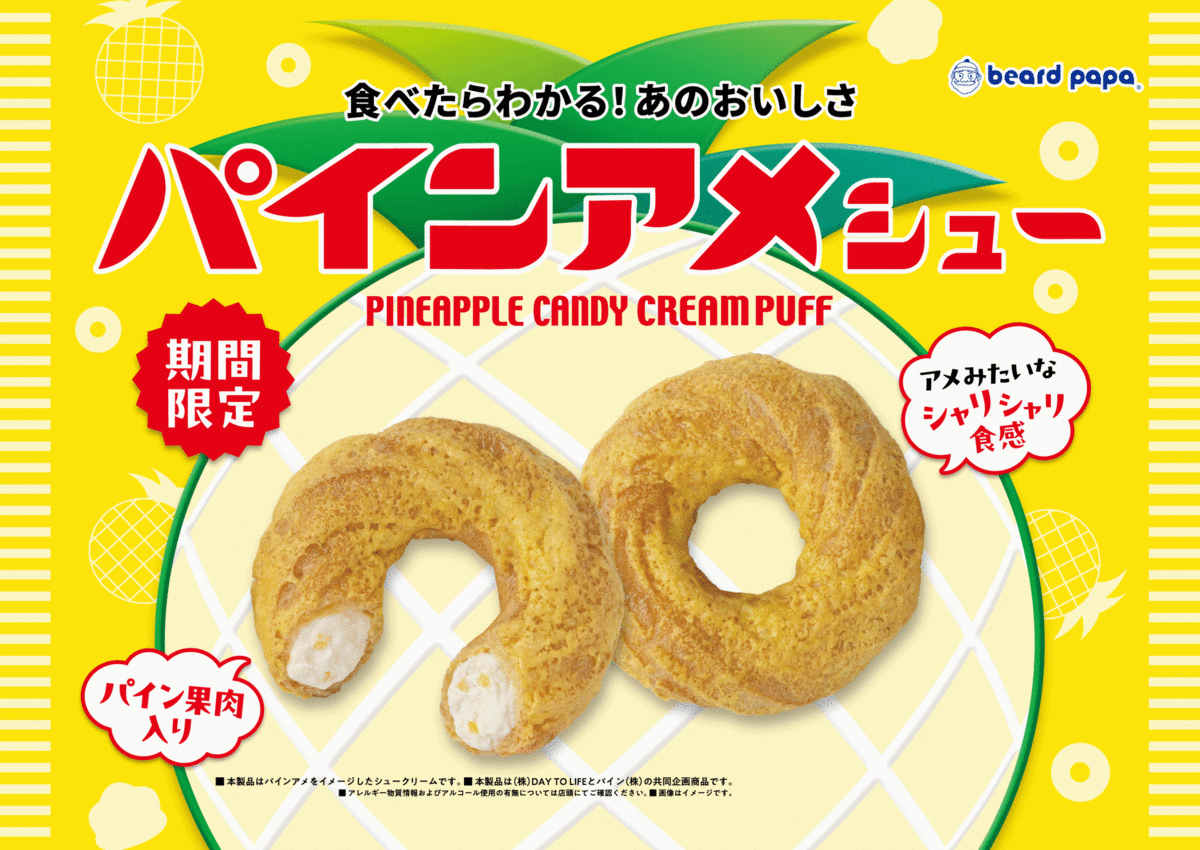今回ビアードパパでは、その味わいと食感をシュークリームで再現した「パインアメシュー」を発売。クリームにはパインの果肉が入り、本物の飴のようなしゃりしゃりとした食感を楽しむことができるという。