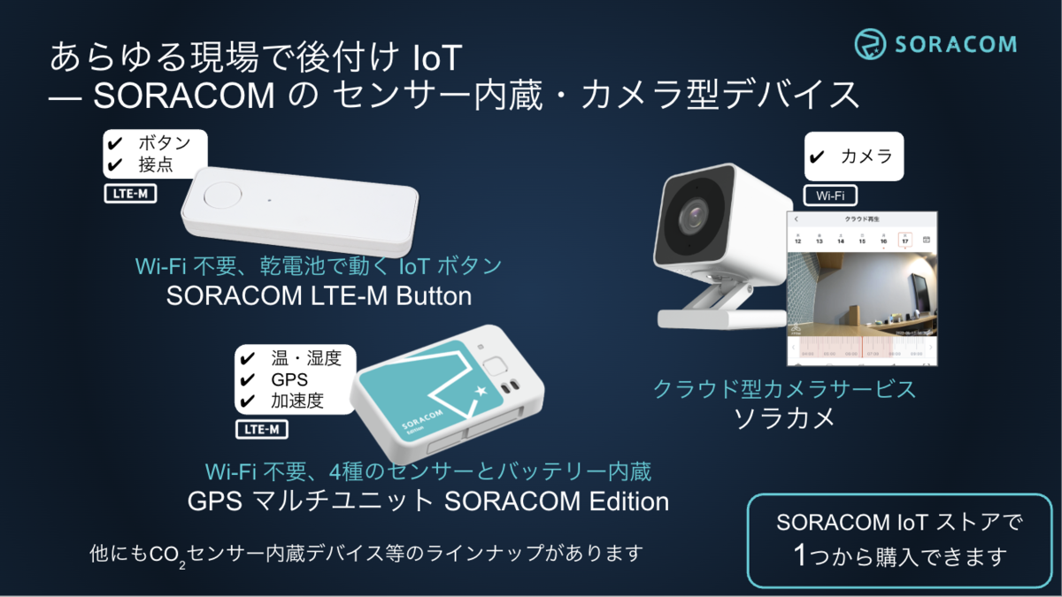 その点、SORACOMの場合、さまざまなセンサーデバイスを用意しており、4種類のセンサーやバッテリーを内蔵したGPSマルチユニット、ボタンや接点の操作を受付ける乾電池駆動のIoTボタン、そしてクラウド型のカメラサービス「ソラカメ」などを用意している。これらはSORACOM IoTストアから1個単位で購入することができるので、気軽に試作を動かすことが可能だ。