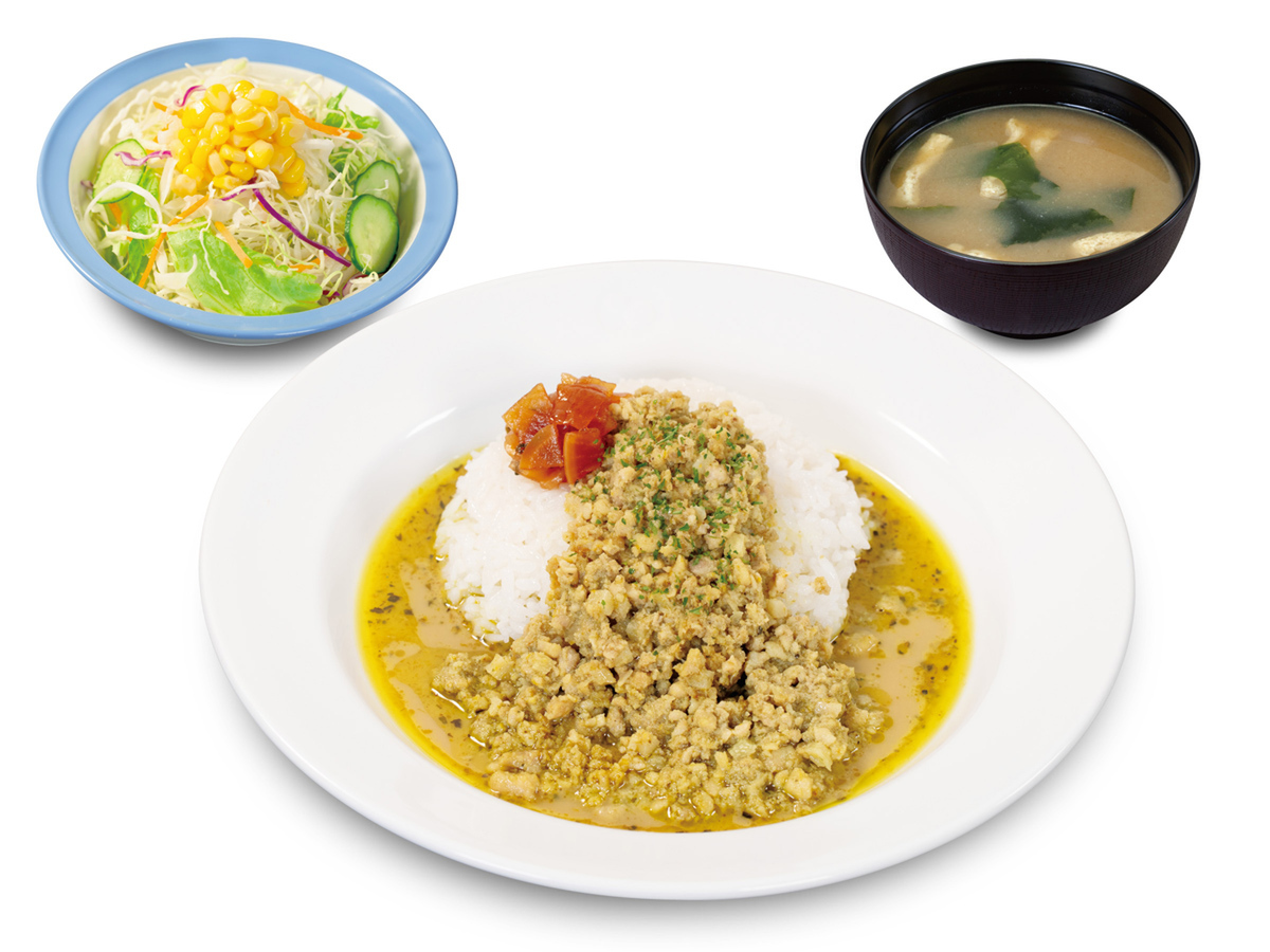 松屋の「ドライグリーンカレー」は、鶏ひき肉のうまみに、ココナッツの風味が香るグリーンカレーソースを合わせた、エスニックな香りと爽やかな辛さがクセになるという一品です。