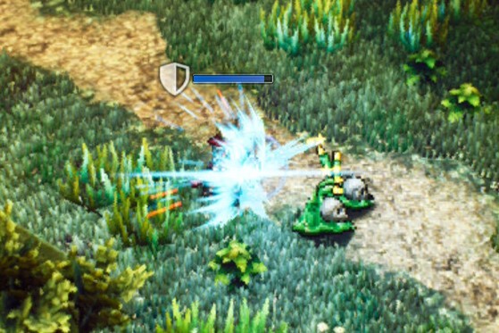 まず戦闘はフィールドの敵シンボルに直接剣を振ったり、弓矢を当てたりして倒す形式。スクエニの作品で例えるならスーパーファミコン(SFC)時代の「聖剣伝説」に近い。敵との間合いをはかり、有利な攻撃を選択して当てていくのは、シンプルゆえに理解も早く気持ちがいい。あの頃の作品が好きだった人にはとくに“刺さる”ゲームと言えるだろう。
