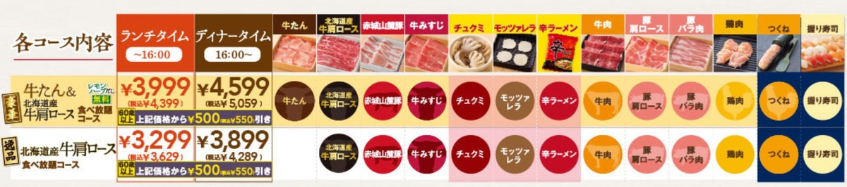 牛たん&北海道産牛肩ロース 食べ放題コース(平日ランチ4399円、平日ディナー5059円)