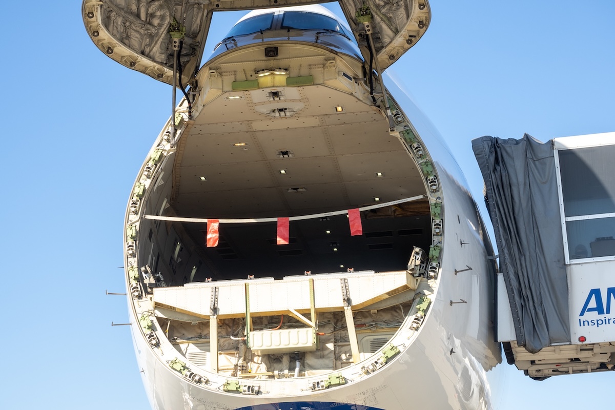 中に入ってみると、2階建て構造の1階部分をまるまると荷室として使えるので、実に広々。そのためクルマやヘリコプター、長尺貨物なども搭載可能です。さらに機首部分が上部に開く「ノーズカーゴドア」を採用しており、機体前方をガバッと開いて貨物の積み下ろしも可能。