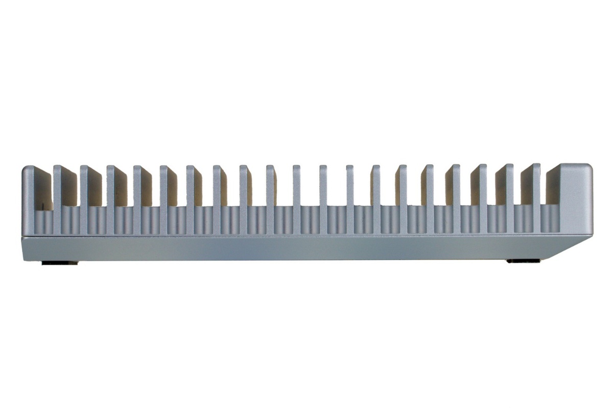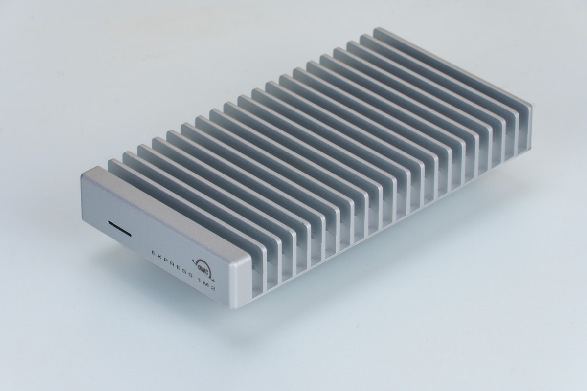 「OWC Express 1M2」は、バスパワー駆動のためUSB-C端子に接続するだけで動作する。ボディには航空機レベルのアルミを採用し、冷却効果を高めるフィン状のデザインが施されているため、放熱性能の面でも優れている。実際に使用時にボディを触ってみると、ほどよく温かく、効率的に放熱されていることがわかる。