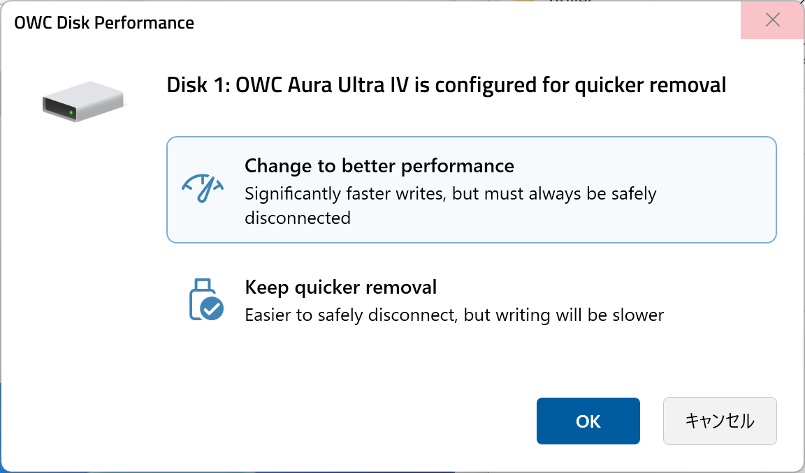 このモードを「パフォーマンスモード」で動作させる必要がある。OWCのサイトでは、この動作変更を簡単に実行できるソフト「OWC Express 1M2」を公開。これをインストールし実行すれば、パフォーマンスモードで実行できるようになる。ただし、ドライブを外す時は「ドライブを取り外す」を実行しないと、データの損失につながる可能性があるので注意しよう。