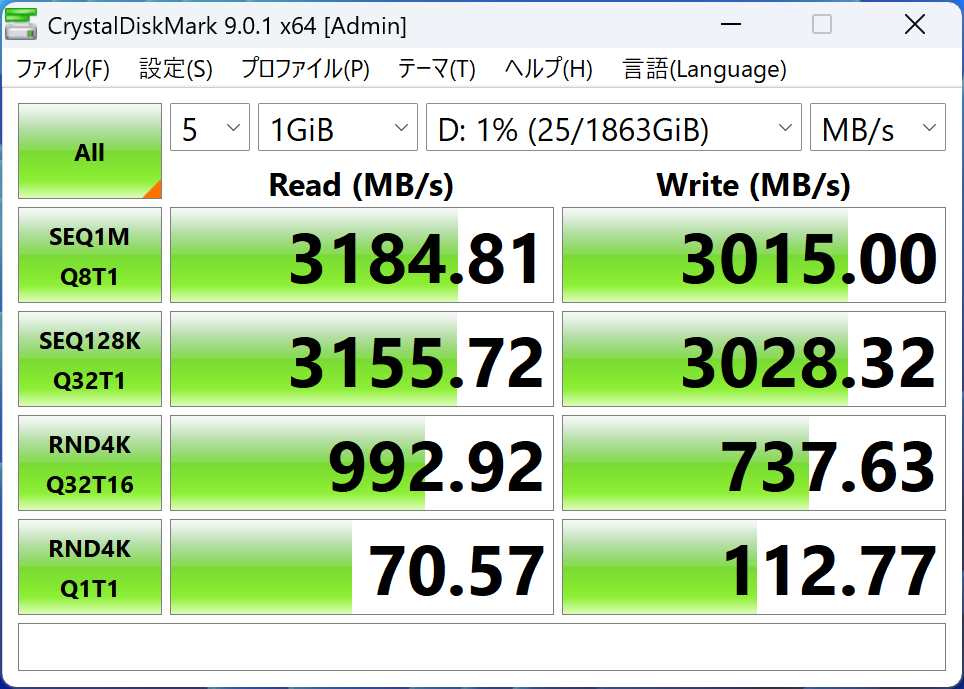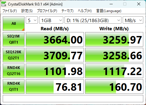 より最新の環境でも試してみた。CPUにIntel Core Ultra 7 265K、マザーボードに「MSI PRO Z890-A WIFI」を組み合わせた自作マシンでThunderbolt 4対応のUSBポートに接続し、「CrystalDiskMark 9.0.1」を実行したところ、シーケンシャルリードで3664MB/秒、シーケンシャルライトで3259MB/秒とさらに速度がアップしていた。
