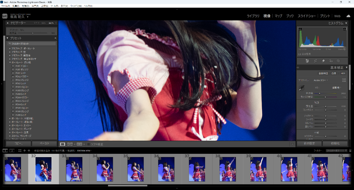 「Lightroom classic CC」での現像画面。ファイルの読み込みが速いと別の写真への移動も早く、プレビュー画像から本画像への切り替えも格段に早くなる