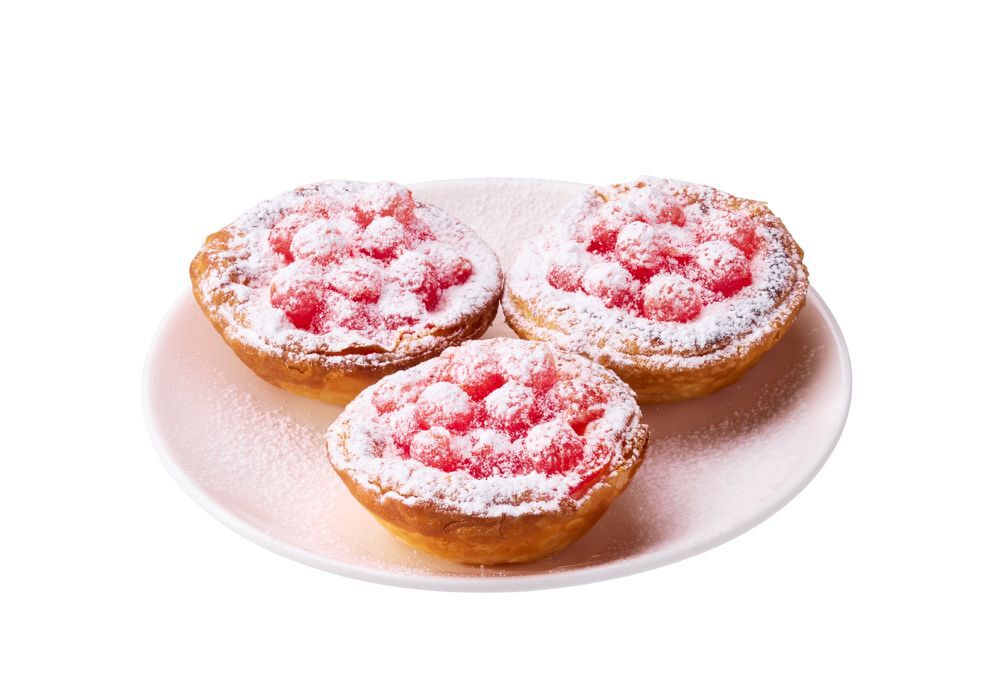 ピンクのもちもちタピオカをのせたエッグタルトで、サクサク生地とぷにぷに食感のコントラストが特徴です。