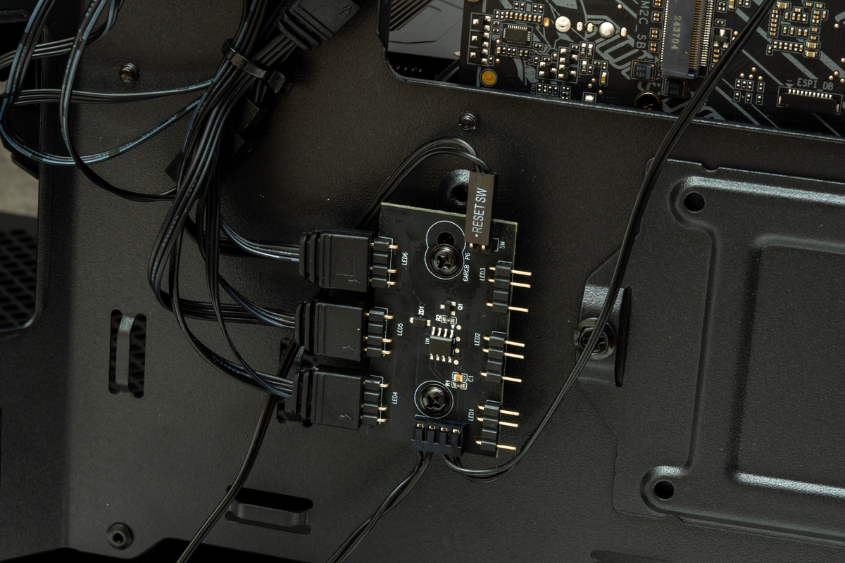 そのうちのフロントサイドとリアのスペースに、3基のアドレサブルRGB LED120mmファンを標準で装備し、PCケースの裏面配線スペースには最大6基のアドレサブルRGB LEDデバイスを接続できるハブ(フロントスイッチでコントロール可能)も装備する。