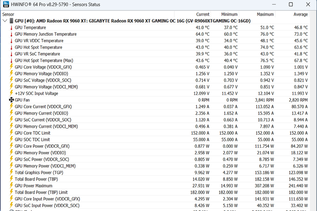 1時間ほど、「モンスターハンターワイルズ ベンチマーク」をループさせたが、GPUコア温度は最大でも51度と、まったく不安を感じない温度に収まっていた。GPUコア内部の最大温度(Hot Spot)76.5度、高発熱なDDR6メモリー温度は76度と、いずれも心配ない温度だった。長時間ゲーミングも安心して楽しめるだろう。