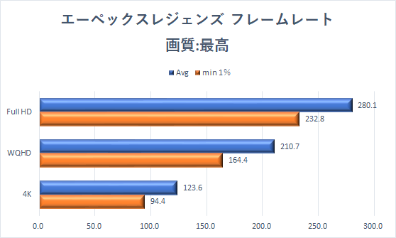 「エーペックスレジェンズ」は、グラフィックス設定にプリセットがないため、最も高くなるように設定したうえで、「射撃訓練場」を一定ルート移動した際のフレームレートを「CapFrameX」で記録した。解像度は3840x2160ドット(4K)、2560×1440ドット(WQHD)、1920×1080ドット(Full HD)の3種類で計測した。