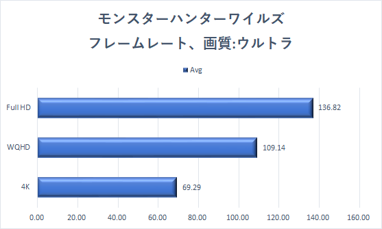 「モンスターハンターワイルズ」のパフォーマンスを、公式ベンチマークを使って確認していこう。グラフィックスは「ウルトラ」をベースに、アップスケーリングなどは「AMD FSR:クオリティ」、「フレーム生成:ON」、「テクスチャ品質:最高(高解像度テクスチャ)」とした。解像度は、ここまでと同じく3種類で実行し、平均fpsをまとめた。