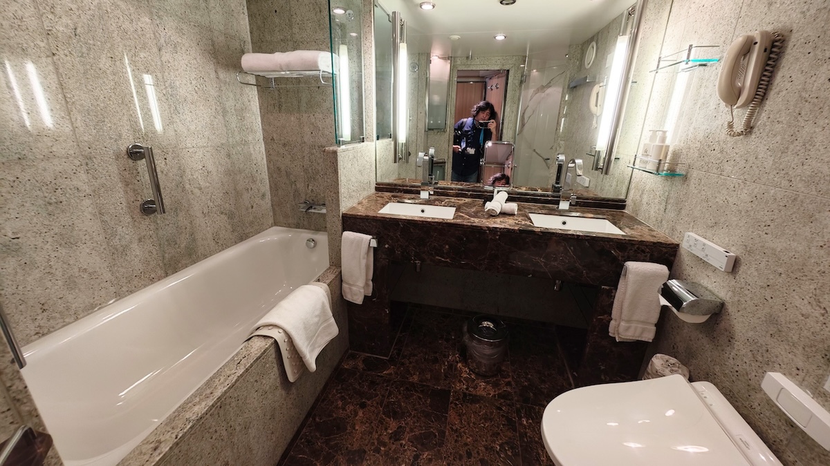 ツインベッドもしくはクイーン仕様のベッドにアレンジ可能で、広々としたクローゼットもあり、さらにバスルームは日本の客船らしくバスタブ付き。日本人にはうれしいポイントですね。料金は、11月の博多発着 済州島クルーズ(3日間)で18万2000円/1人〜(1室2名)となっています。