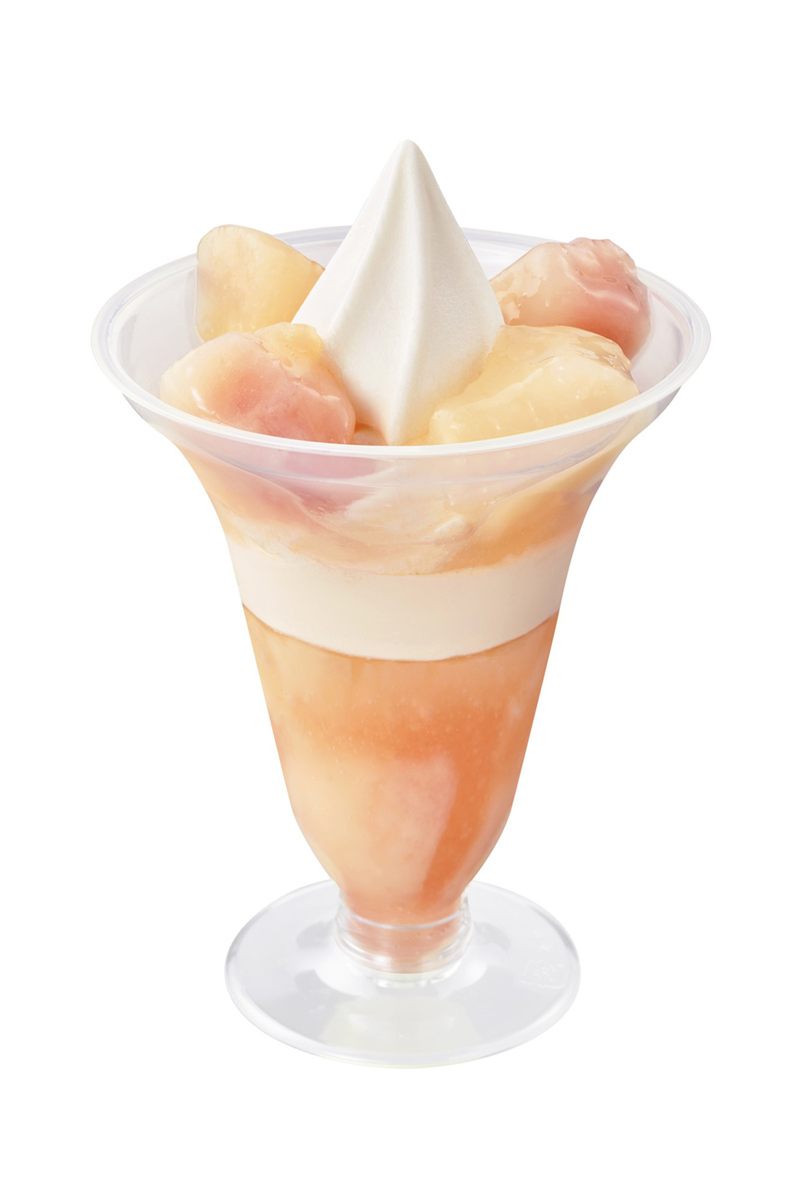 旬の完熟白桃をたっぷり使ったパフェで、白桃の甘くみずみずしい香りと北海道産ミルクソフトのなめらかな味わいが特徴です。