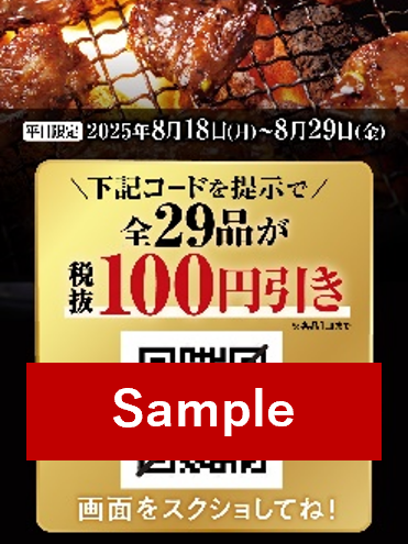 キャンペーン専用ページのQRコードを提示することで対象商品の29品が各1皿110円引きとなる。各1品1皿のみ割引が適用される。
