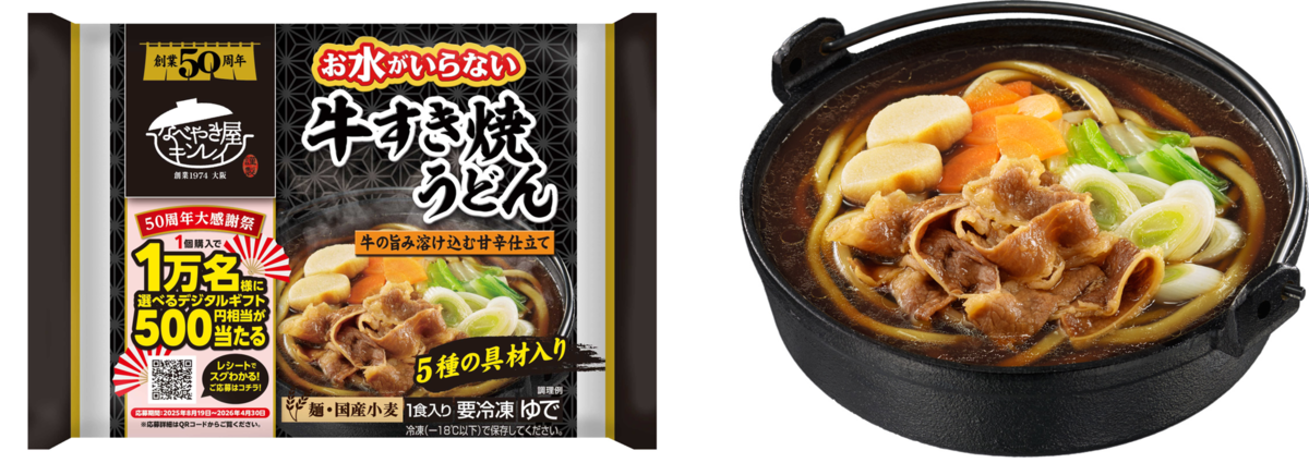 キンレイの冷凍具付きうどん・ラーメン「お水がいらない」シリーズは累計2億食以上突破する同社の看板ブランド。今回は、2023年の販売終了後した「牛すき焼うどん」「ほうとう」を復活販売します。