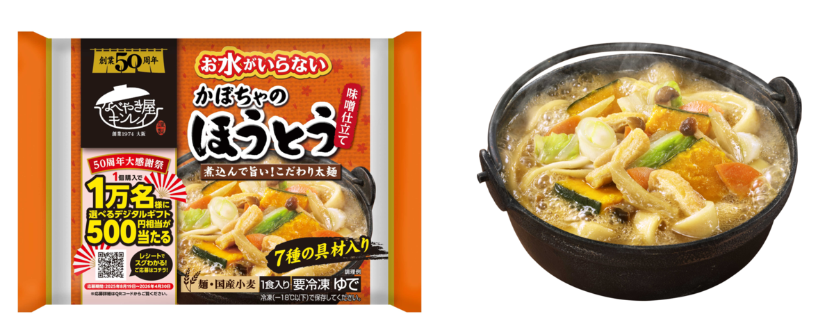 キンレイは、冷凍具付きうどん「お水がいらない 牛すき焼うどん」「お水がいらないかぼちゃのほうとう」の2品を復活販売します。8月19日より全国の量販店やドラッグストアの冷凍コーナーで順次展開予定。いずれもオープン価格。