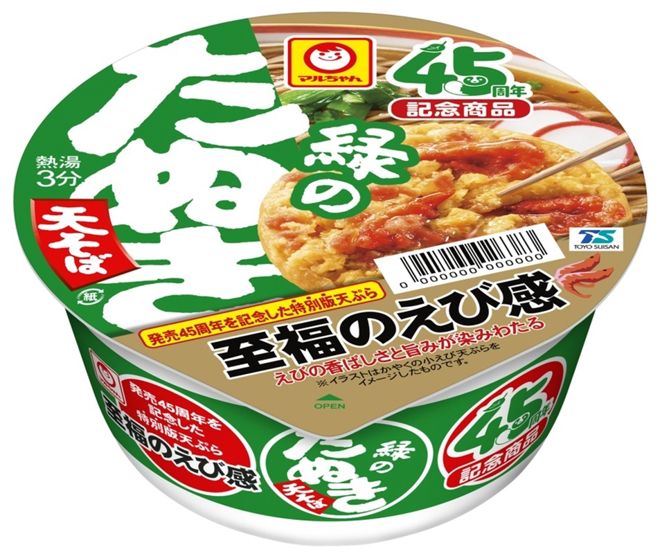 これを記念した商品として、えびの香ばしさと旨みが染みわたる特別版の天ぷらを加えた「緑のたぬき天そば 45周年記念商品」が登場。