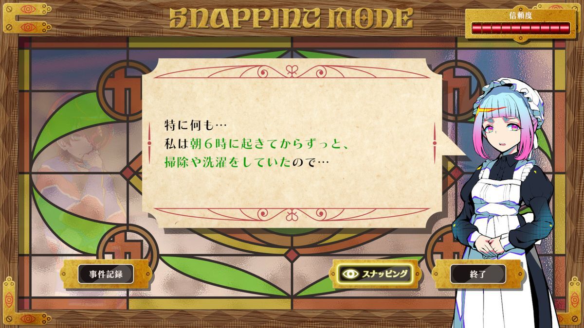 まず「推理アドベンチャー」の法務省 犬神軋ルート。これがある意味、小高氏の代表作「ダンガンロンパ」っぽいジャンルと言えるだろう。ある殺人事件が起こるので、捜査パートで現場を調べて証拠を入手。のちに学級裁判みたいなキャラ同士の掛け合いパートへ移り、議論に対抗する証拠をぶつけて論破していく。いちファンとして懐かしさすら覚える流れだ。