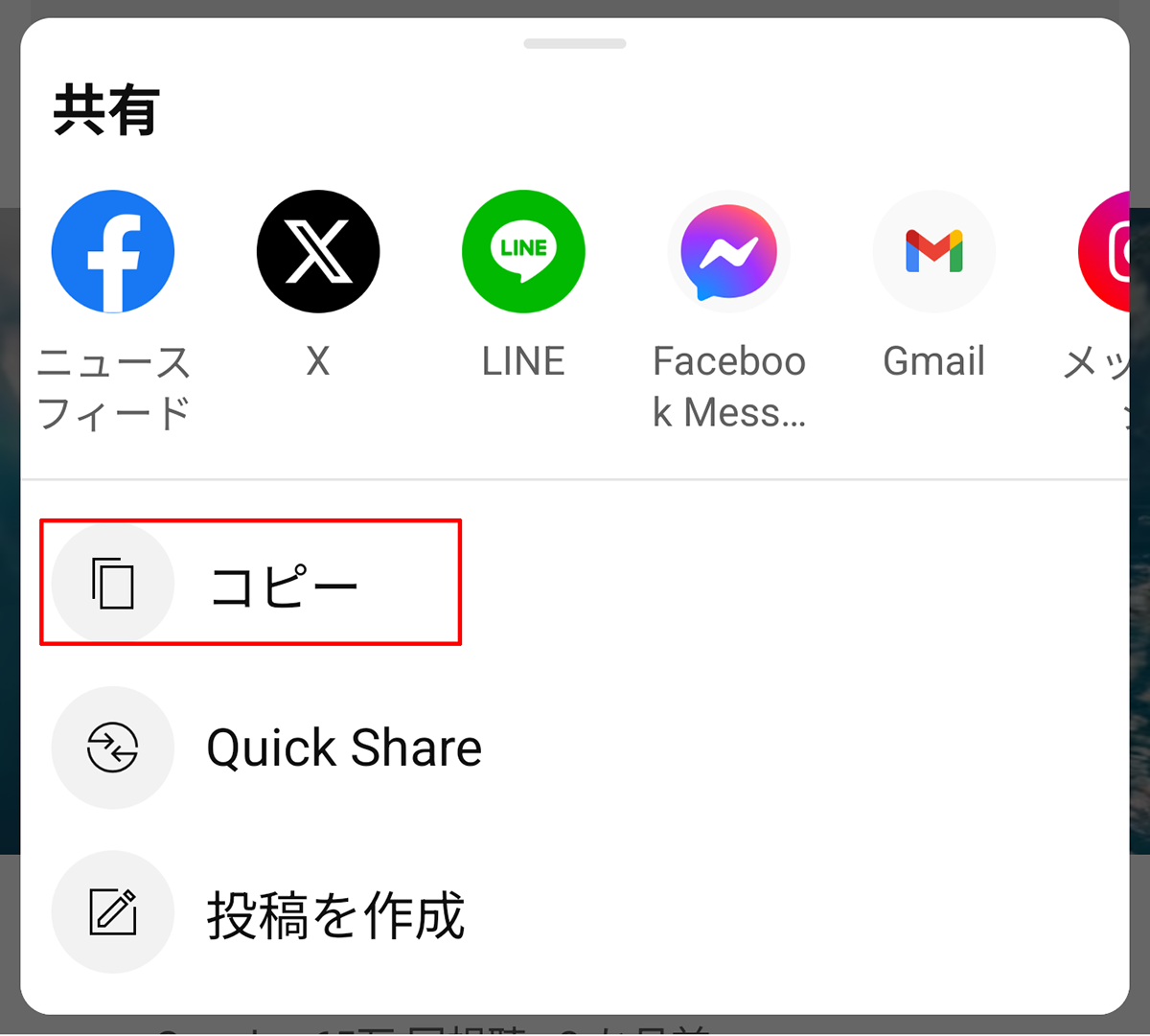 ダイアログから「コピー」をタップして動画のURLをコピーしよう。