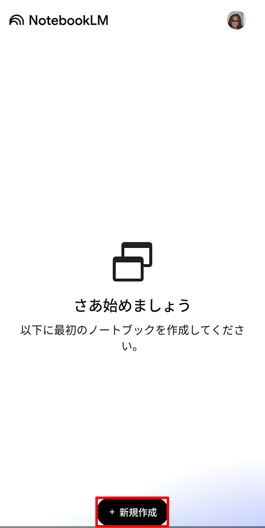 次にNotebookLMアプリを開き、グーグルアカウントでログイン。画面下部の「新規作成」をタップ。
