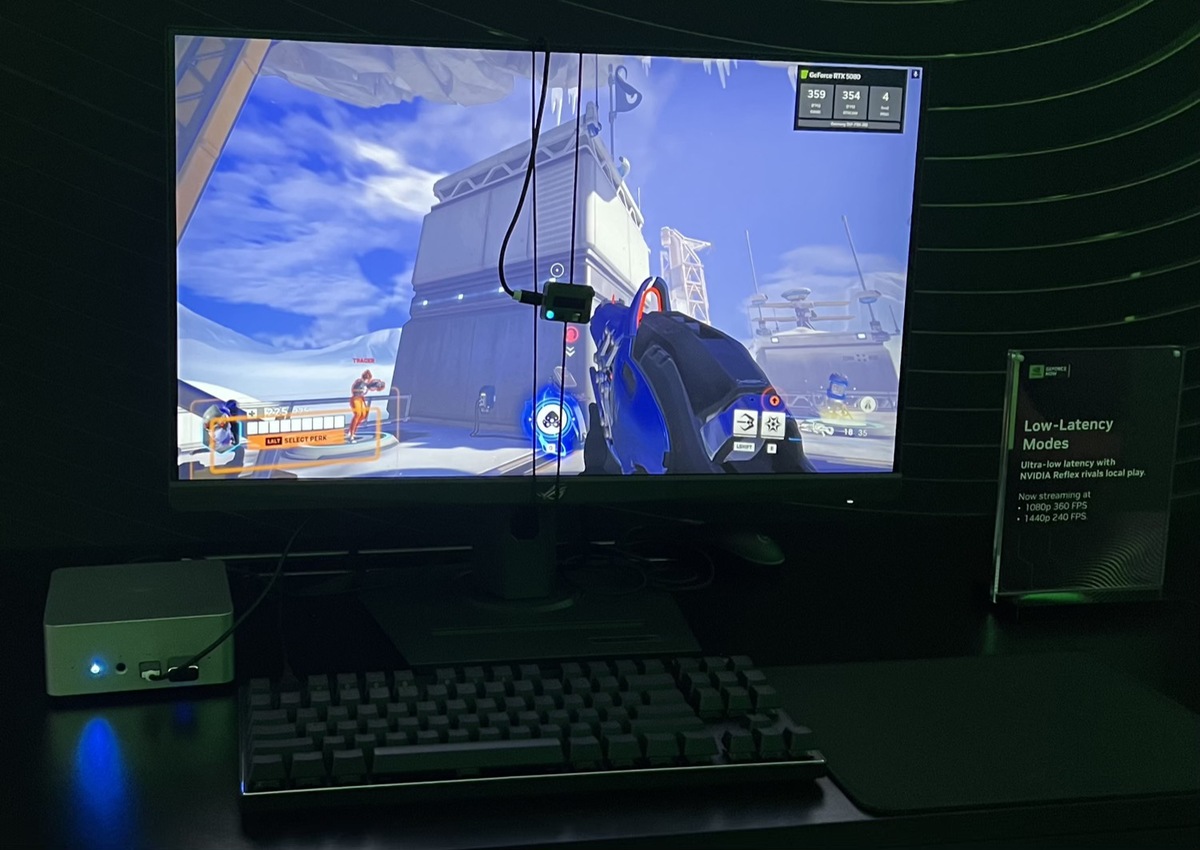デモセッションではOverwatch 2に「LDAT2」を組み合わせてE-Eシステムレイテンシーを計測していた。画面右上の数値は左からゲーム側フレームレート、ストリームのフレームレート、サーバーへのPingである。解像度はフルHDで、360fps近辺で動いていることがわかる