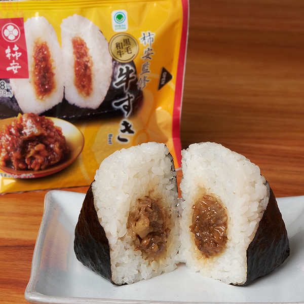 国産黒毛和牛を秘伝のタレで炊き上げたすき焼き風のおむすびです。すき焼麩・玉ねぎ、ねぎエキスも一緒に炊き上げることで野菜の旨味が加わり、深い味わいを手軽に味わえるおむすびに仕上げています。