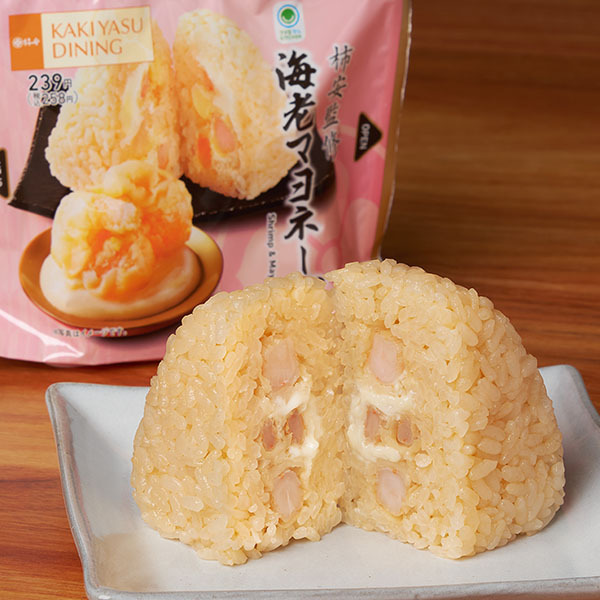 「柿安ダイニング」の看板メニューをイメージしたおむすびです。衣を付けて揚げた海老に、コンデンスミルクや三温糖を使った甘めのマヨソースを合わせ、甲殻類の旨みを感じるピラフで包んだ洋風の味わいです。