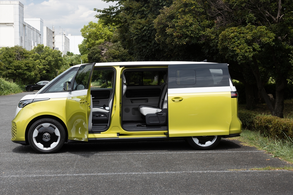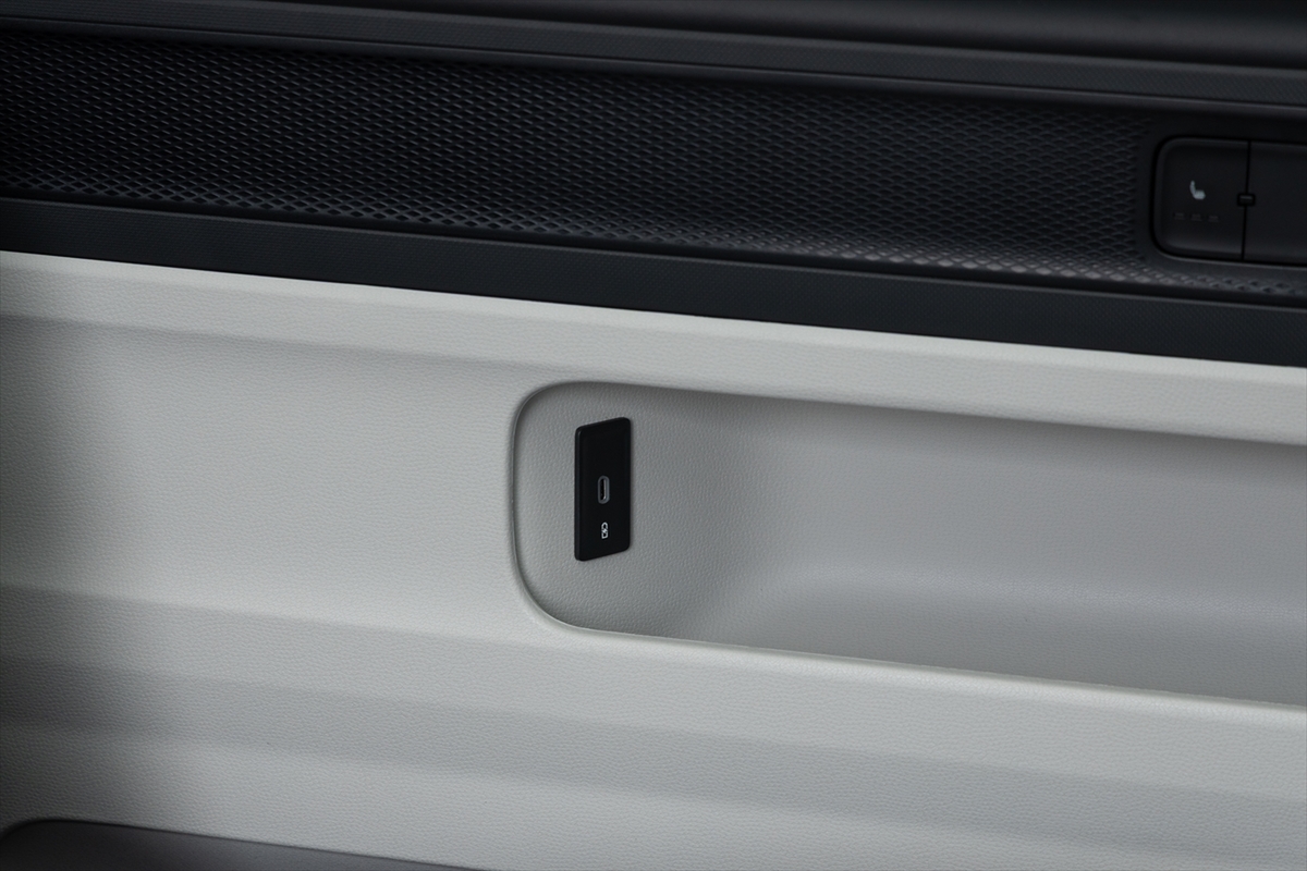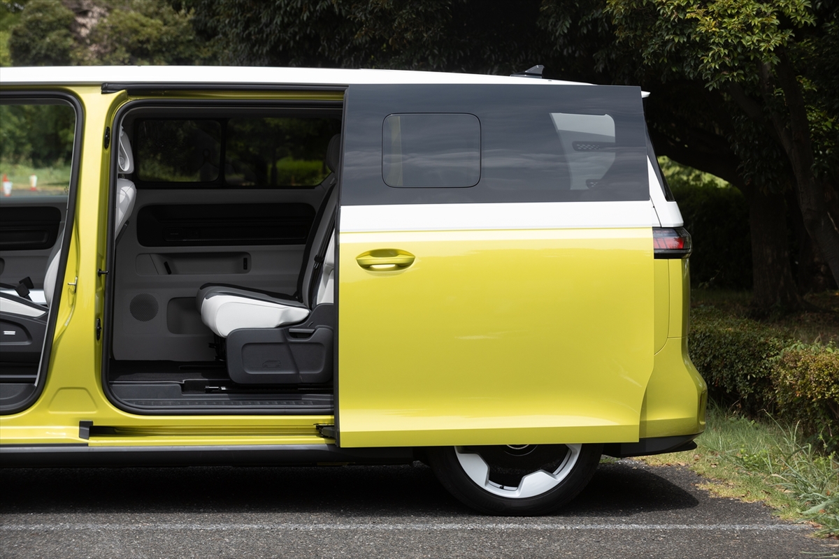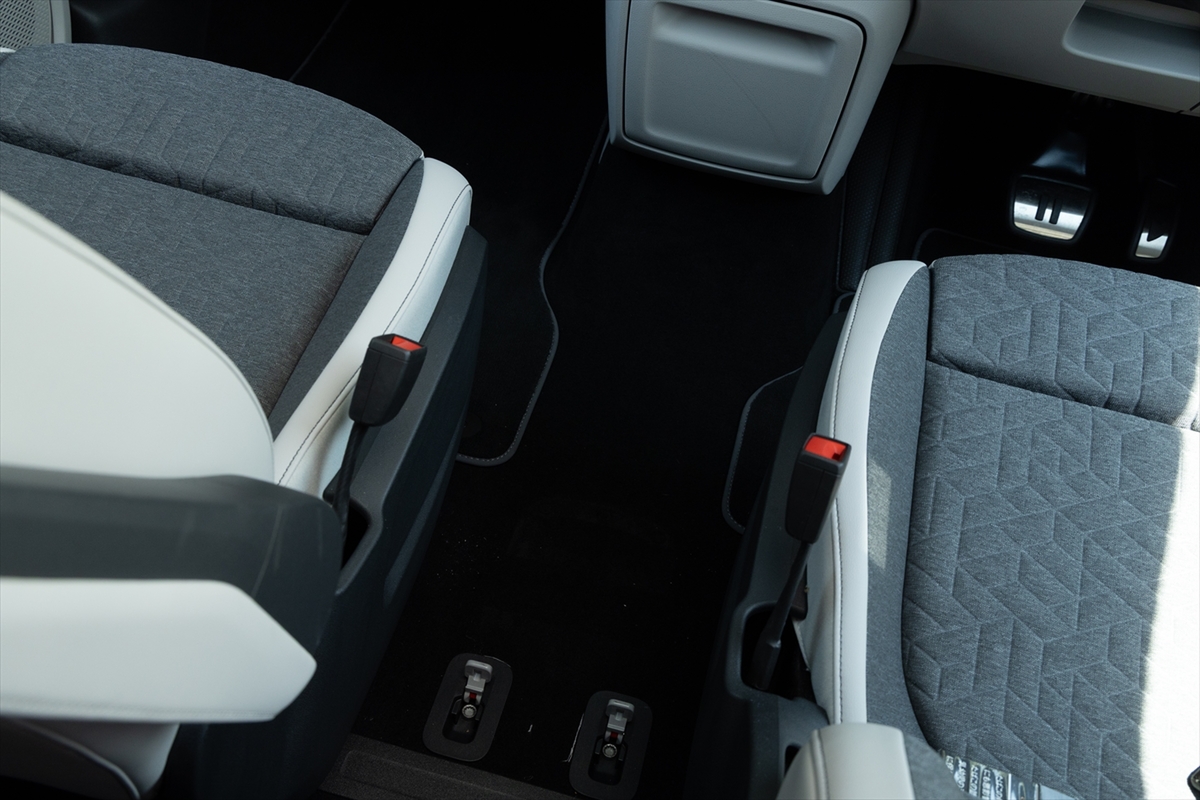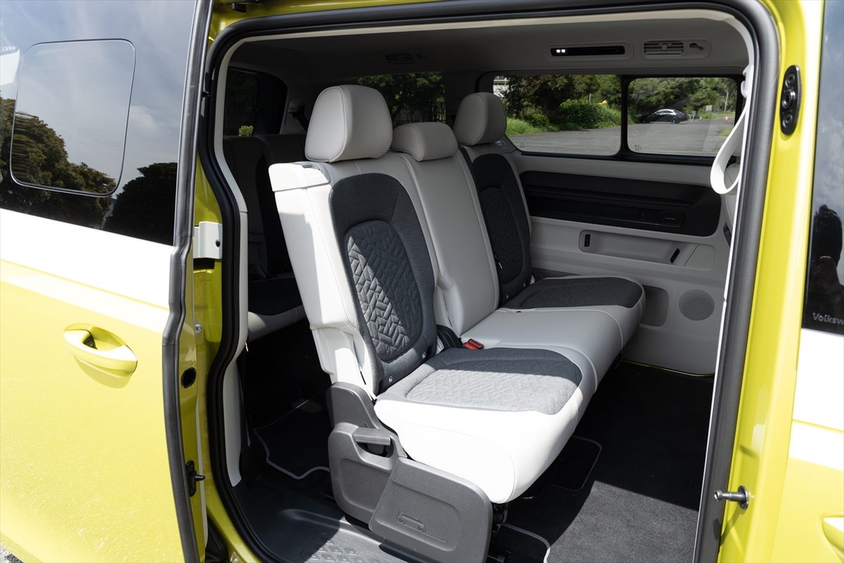 スライドドアが大きく、乗降性が優れるのもいいところ。3列目へは2列目シートを前に倒して乗降できます。車内は広いのですが、アルファードやVクラスのような高級感とは対極のカジュアルな雰囲気。1000万円でカジュアルが許せるかどうかが、このID.Buzzのポイントになりそうです。3列目は2座で、シートごとにUSB Type-C充電ポートを用意。足元もかなり広めの印象です。