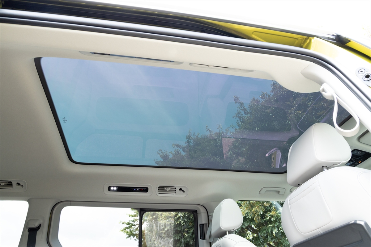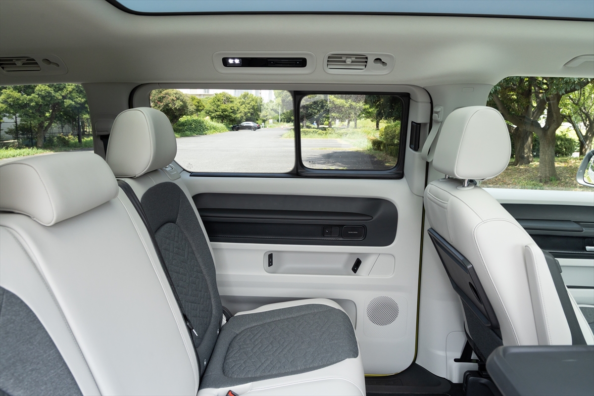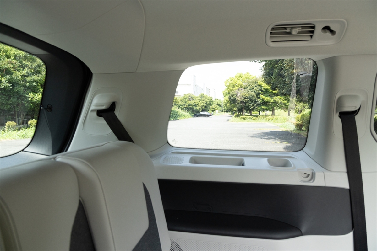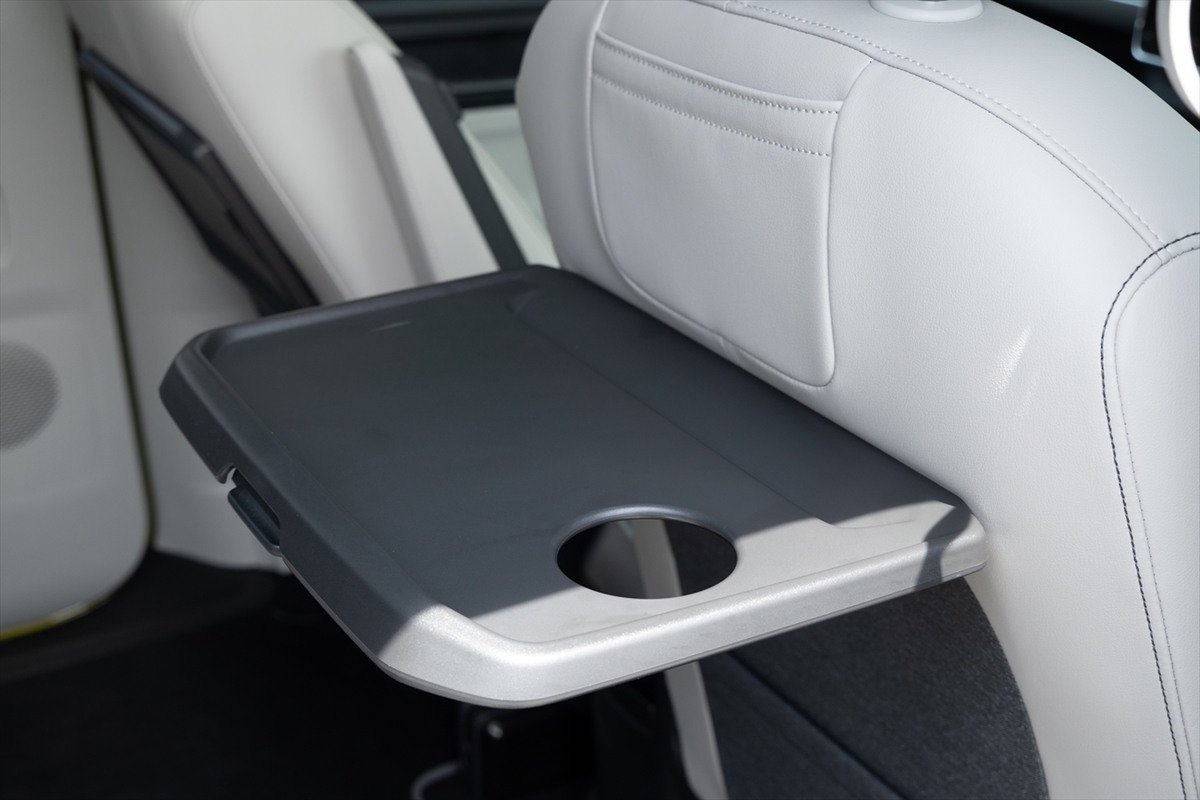2列目がベンチシート(3名)はちょっと珍しい仕様。キャプテンシートではありませんので、オットマンなどの快適装備はありません。そしてテーブルがあるのですが、ドリンクホルダー部分は穴があいているのみ……。天井はサンルーフがついており、開放感たっぷりです。