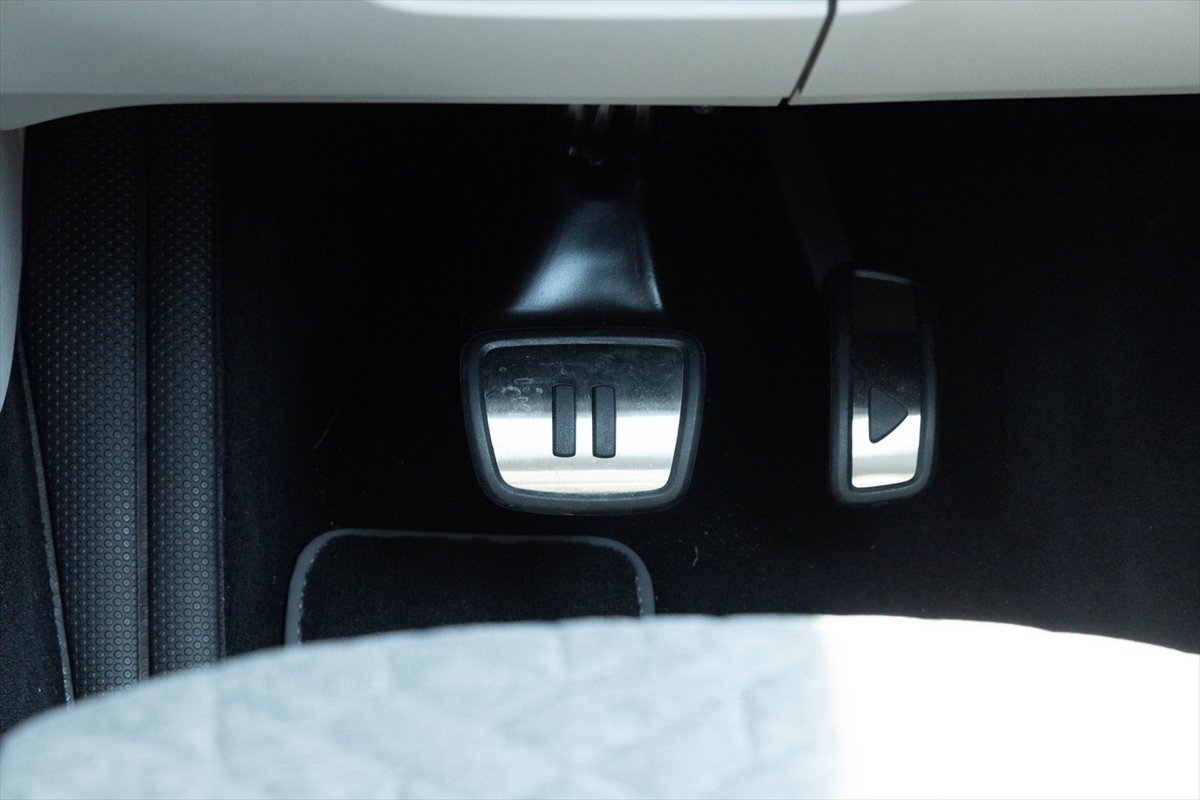 運転席もミニマリストで、メーターパネルには速度などが表示する程度。センターコンソールに置かれたタッチパネルは、いわゆるディスプレイオーディオで、スマホとつなげてナビとなる仕様です。なので、車載ナビはありません。ペダルがアルミでちょっとスポーティーだったりします。