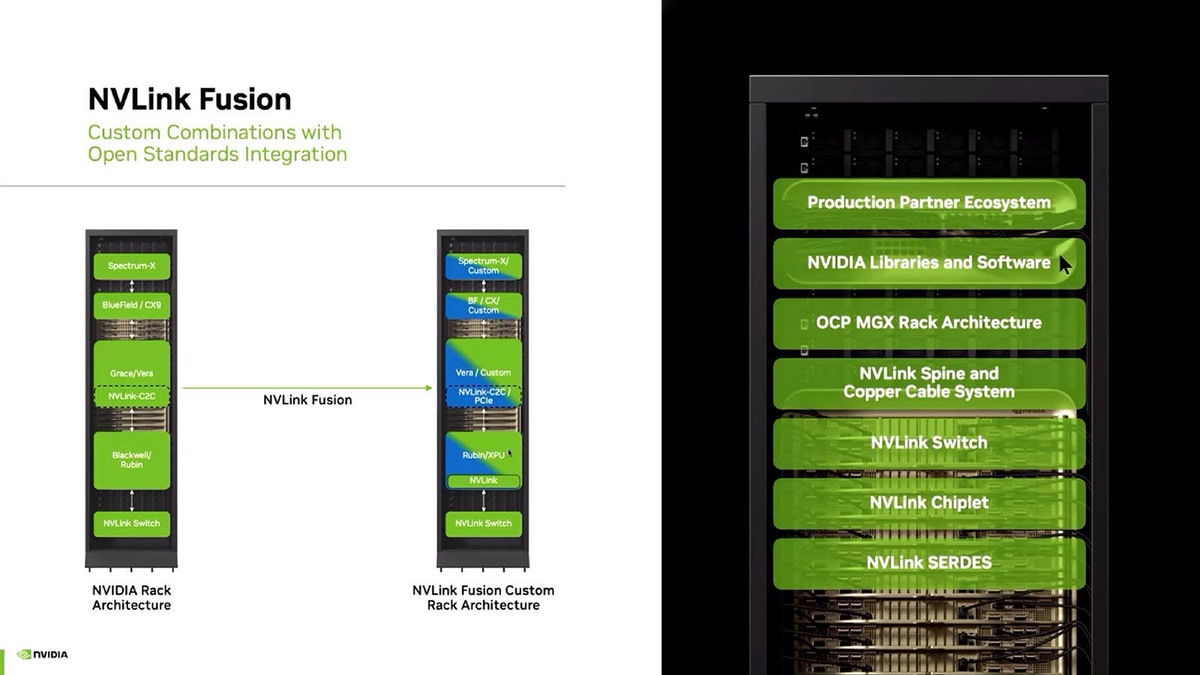 NVLinkやNVSwitchは(AMDのInfinity Fabric同様に)NVIDIA独自のものであり仕様などは一切公開されていないのだが、今年のCOMPUTEXにおいてNVIDIAはNVLink Fusionを発表した。