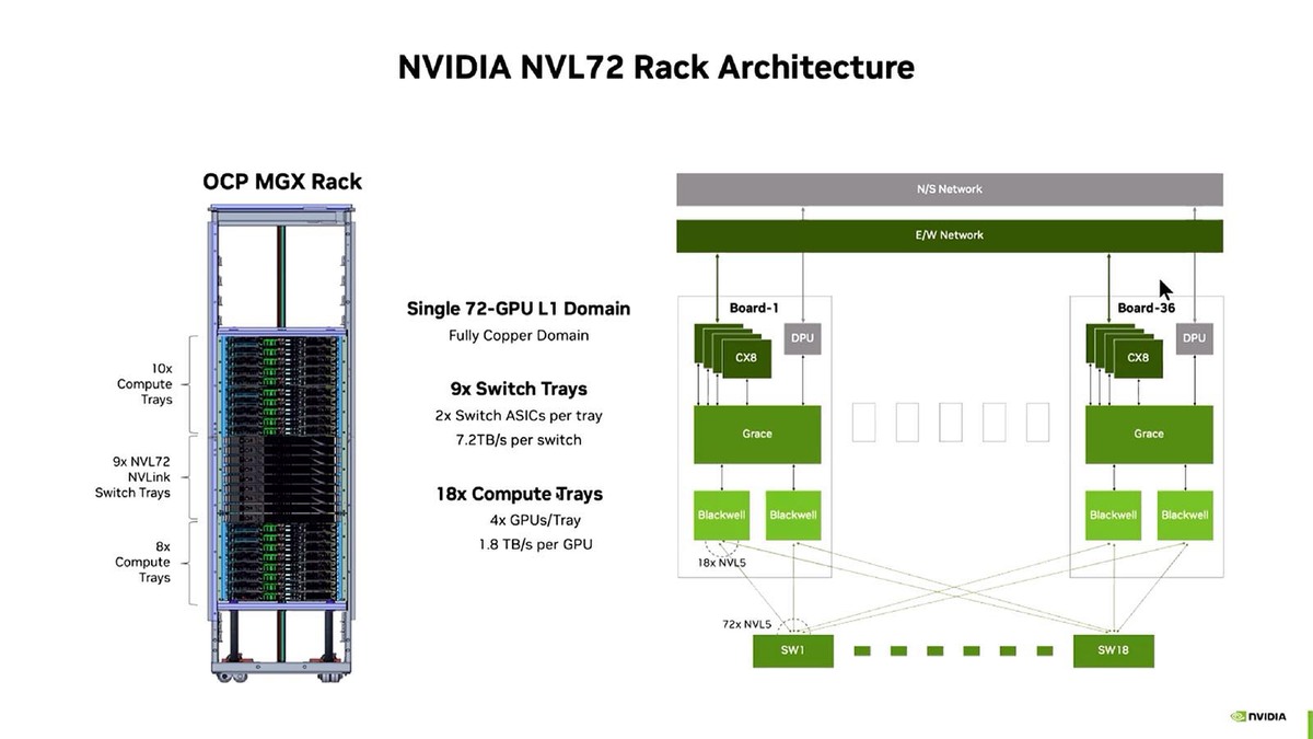 もっともこれは概念図かと思われる。少なくともNVLink Fusionを使う場合にはNVL72のラックをそのまま流用しなければいけないという縛りはなく、ただ構成を説明するのにNVL72と同じような構成が利用できるというだけかと思われる。