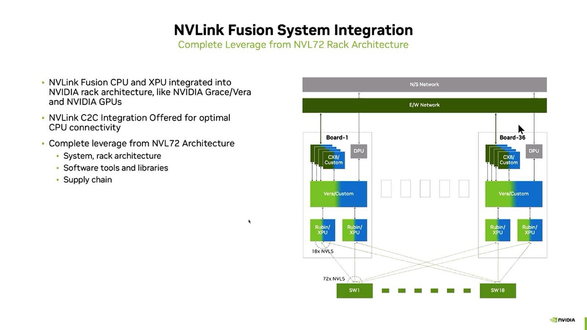 実際NVLink Fusionでサポートされる最初の世代は次のVera/Rubinの組み合わせになるが、現在のNVL72の構成のまま、カスタムチップで混在可能と説明されている。