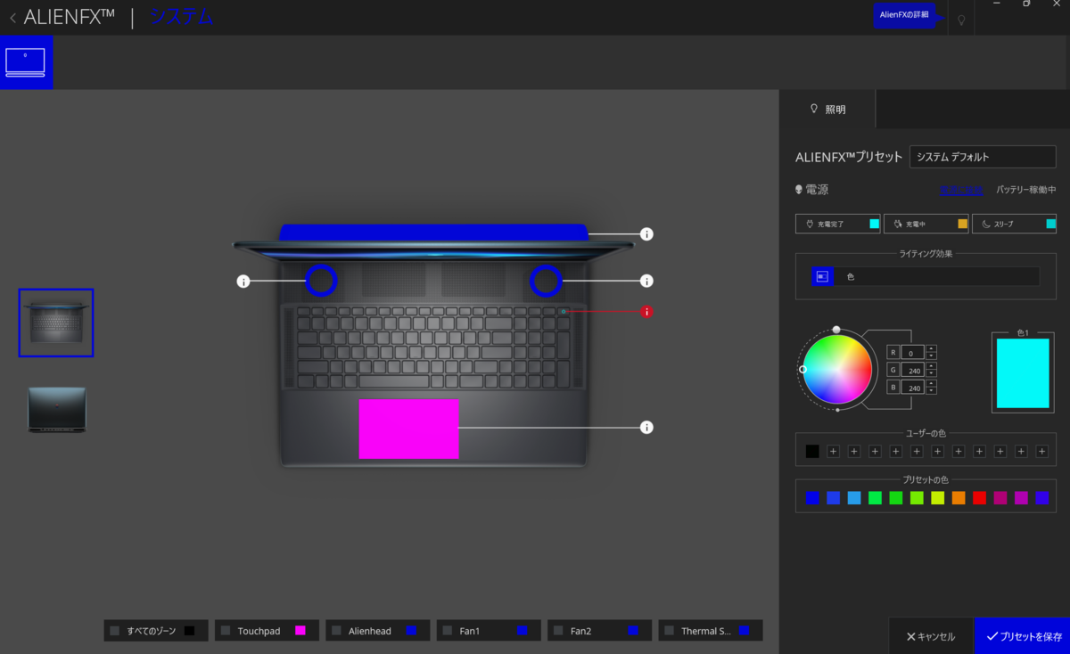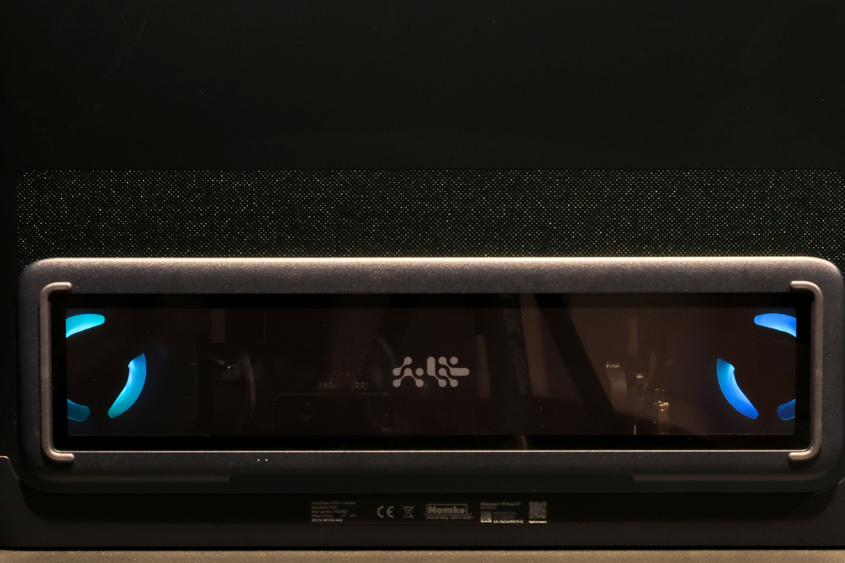 また、「AlienFXファン」は冷却の役割を持ちながら、RGBライティングが施されています。筐体底面の透明なGorilla Glass窓越しに、その光が映り込むよう設計されており、冷却状態を視認できるのが非常にゲーミングマシンぽくてかっこいい仕上がりになってました。