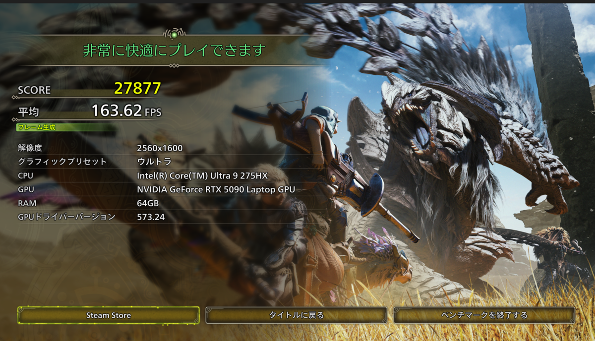 続いて、AAAタイトルと呼ばれる「モンスターハンターワイルズ ベンチマーク」でトライ。フレーム生成機能はオン。解像度は2560×1600ドット、グラフィックプリセットは「ウルトラ」という最高品質で検証してみました。