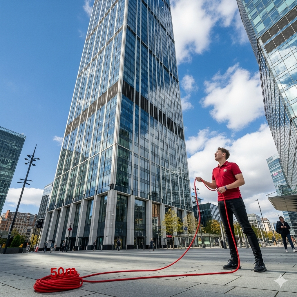 あなたの手には長さ50メートルのロープがあり、高さ100メートルはありそうなビルの高さを測ろうとしています。ただし、あなたの身体(身長は170cm)とロープ(1本しかありません)以外になにも使わず、なるべく正確にビルの高さを計測するにはどうすればよいでしょうか。詳しく解説してください。計算をともなう場合は、その際に使用した数式も提示してください。可能なら図示もしてください。