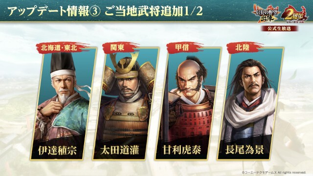 地域ごとに異なる武将がフィールド上に登場する「ご当地武将」に、新たに9人の武将を追加。