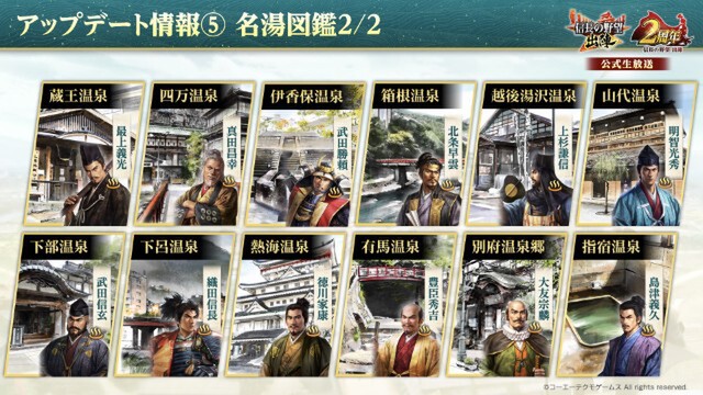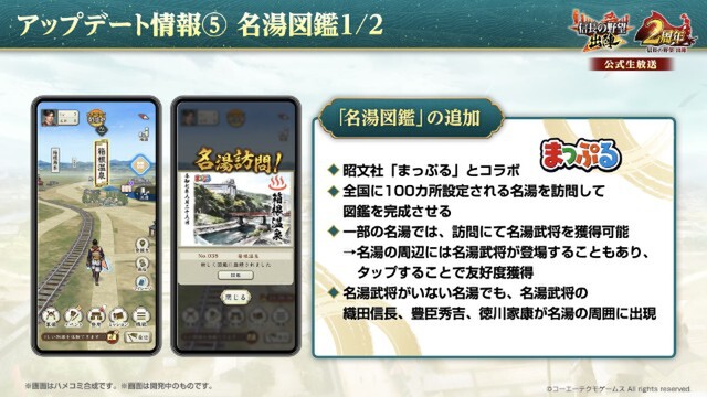全国に100ヵ所設定される名湯を訪問して完成させる「名湯図鑑」が登場。一部の名湯では、訪問することでその温泉にゆかりのある「名湯武将」を獲得できる。