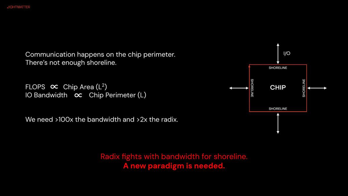 I/Oはチップの周辺に配されるから、I/Oの数はチップ周囲の長さに比例する。一方で計算能力はチップの面積に比例するから、どうやっても足りなくなる。ここでいうLはチップの長さ(縦でも横でもよいが)であり、現時点でも100倍くらいのギャップがある