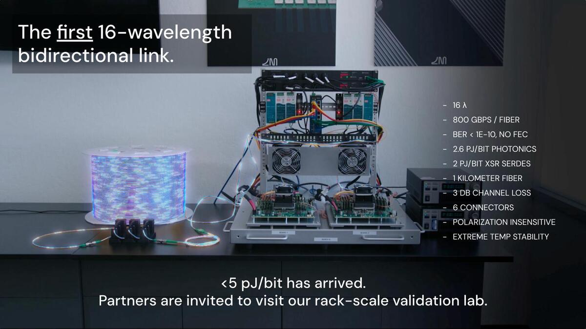 また2つのPassageのシステム間を光ファイバーでつないで、800Gbps/Fiberの速度で1kmの距離の転送の動作デモも行なわれたことが示された。