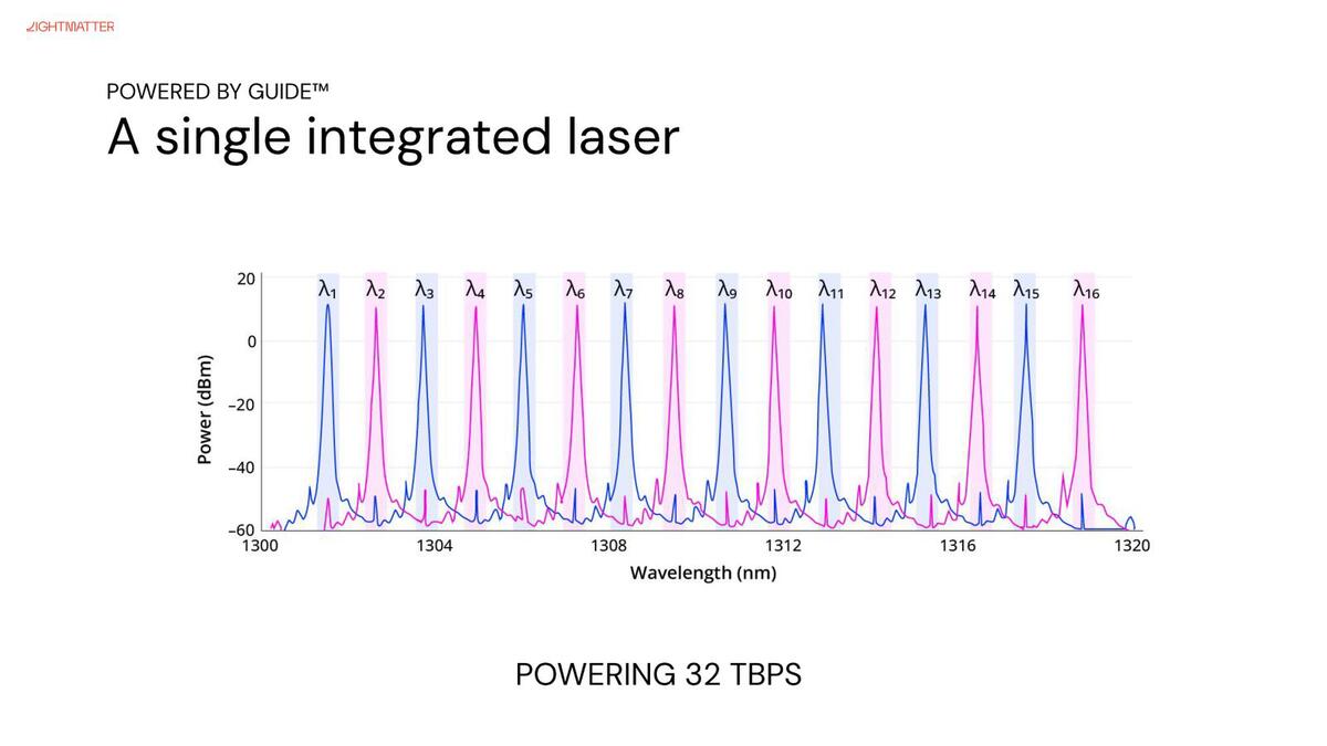もともとPassageは内部に光信号の光源を持たないので、外部から連続光を取り込み、これをPassage内のMRMを利用してOn/Offすることで光信号にする。その外部の光源であるガイドは、下の画像のように1301~1318nmの範囲をほぼ1nm刻みで16波長の光を生成するようになっており、これを利用して1本の光ファイバーで双方向400Gbpsづつ、合計で800Gbpsの帯域を持つ。