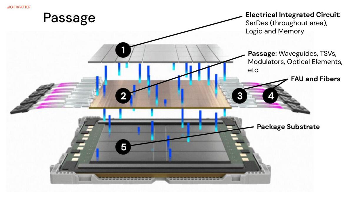 Passageの基本的な構造が下の歯像だ。Passageはインターポーザー的な位置付けにあり、パッケージとASICの間に挟まる形になる光インターコネクト層である。おもしろいのはASICの部分にEICが含まれることだが、ASICとEICをどう混在させるのか、あるいは積層するのかは後述する。