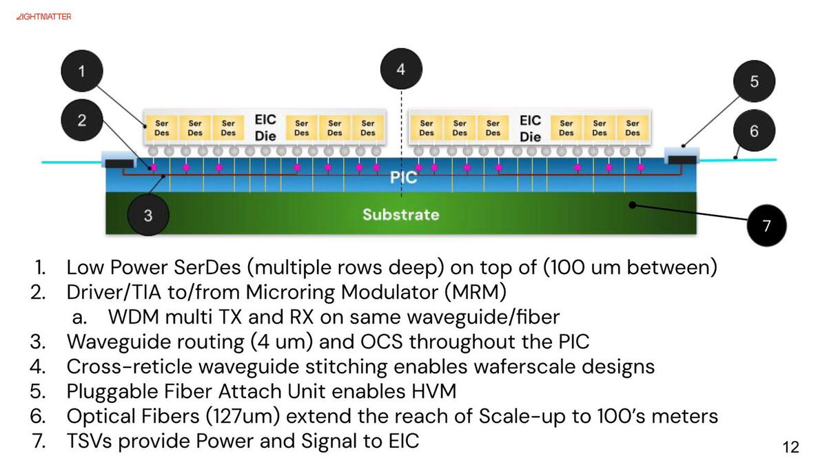 これにより、このインターポーザーに載った複数のASIC(の下敷きになっているEIC)同士の通信も極めて広帯域が実現できるし、チップ(というかパッケージ)外への接続も、パッケージ端にあるFiber Attach経由で光ファイバーを接続することで可能になるとする。