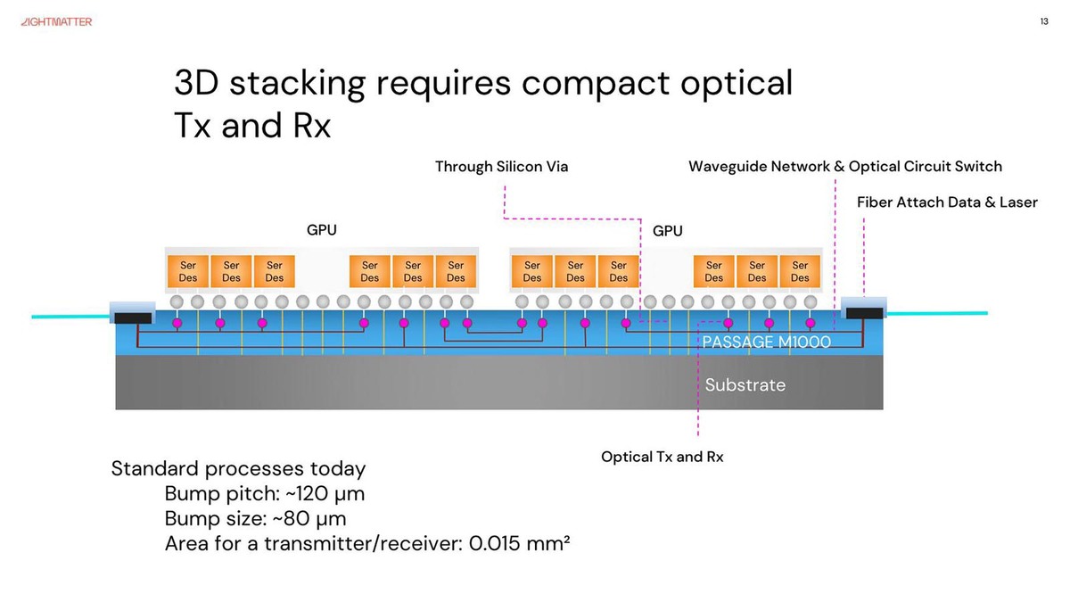 従来のCPOではパッケージの外側にEICとPICを配して、そこから外部に光信号を送り出す形になっていたが、Passageではチップの真下から光信号を出せることになる。つまりパッケージの辺の長さに比例するのではなく、パッケージの面積に比例する形で光信号の送受信が可能になるというわけだ。