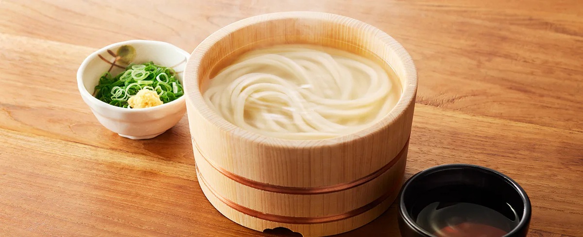 「釜揚げうどん」は小麦、塩、水だけを使用して店内製麺したうどんを、茹でたての状態で釜からそのまま桶に入れて提供するメニュー。無料で利用できる、しょうが、ねぎ、すりごま、天かすを自由に添えられます(関連記事)。