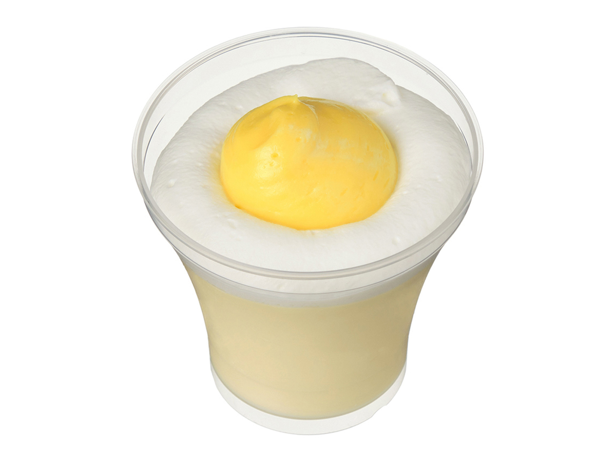カスタードみるくプリン、ミルクホイップ、カスタードホイップのやさしい甘さに、カラメルソースのほろ苦さがアクセントとなっています。