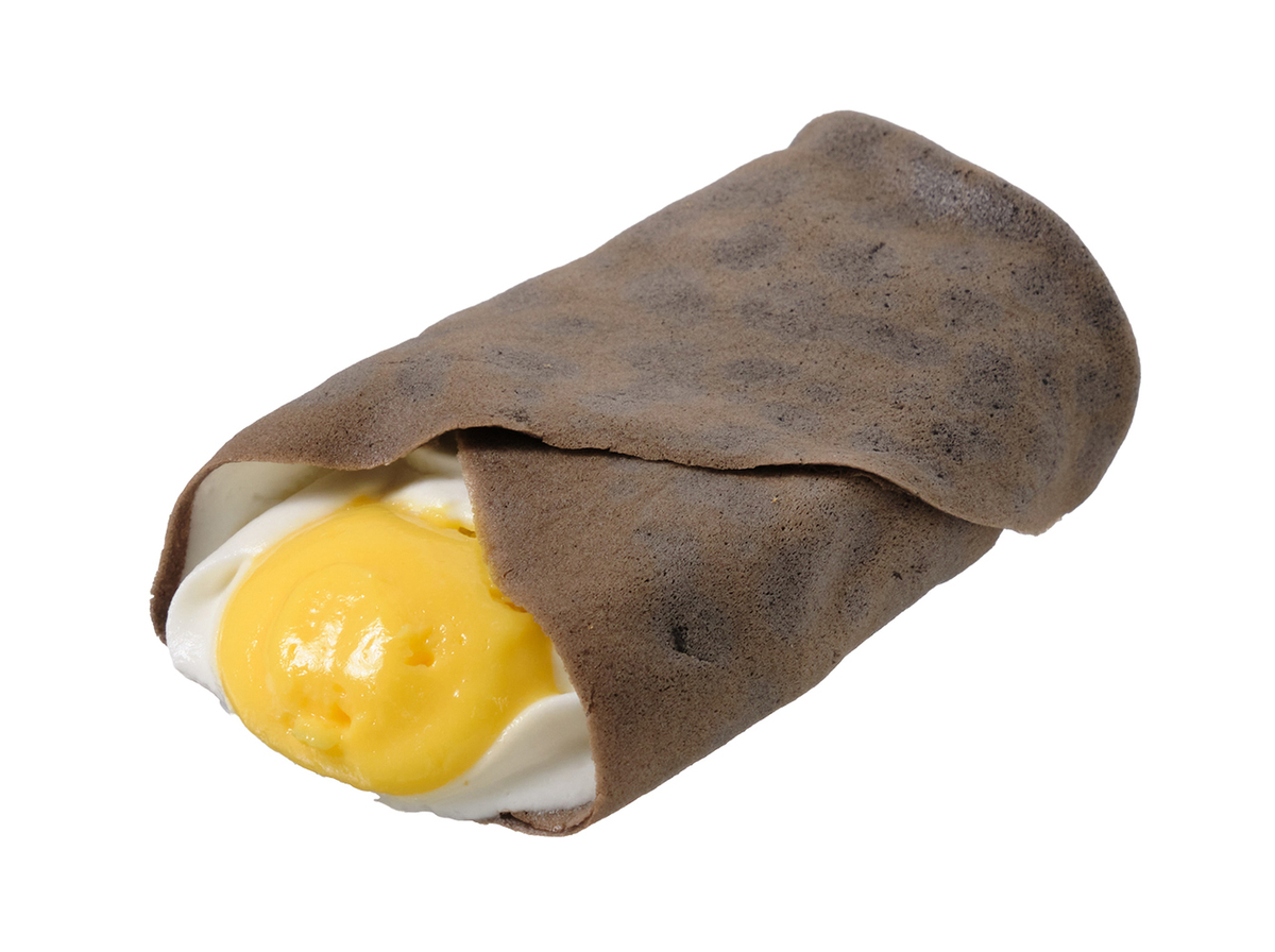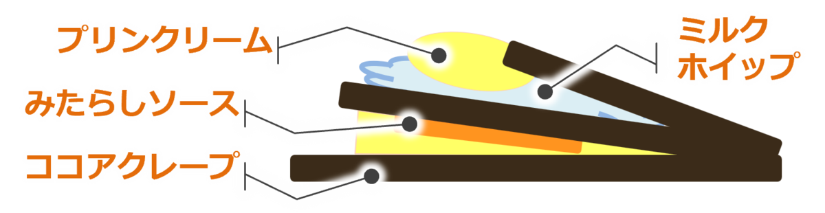 黒いココアクレープを夜空に、白いホイップを雲に、黄色いプリンクリームを月に見立てた見た目が特徴です。